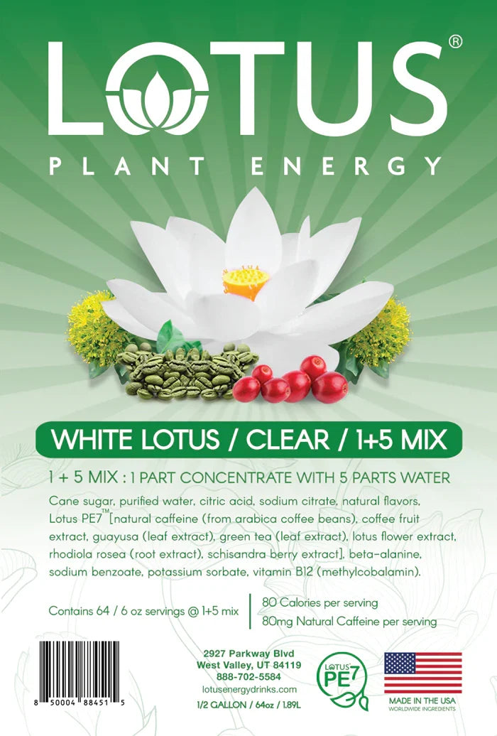White Lotus Plant Energy Concentrate (1+5) Mix adds a (clear) new dimension to our plant-based energy drinks. This pure colorless concentrate has the great flavor of Lotus that can be mixed with any of your favorite flavored syrups to create any color in the rainbow! White Lotus feature’s coffee fruit (cascara) with nature's elite "adaptogenic” botanicals, natural caffeine from green coffee beans, and pure cane sugar. Feature's a built-in cost efficient pump dispenser and unlimited post-mix ability through multiple dispensing systems. White Lotus Energy offers superior taste and function at less than half the cost of market-leading energy drinks!